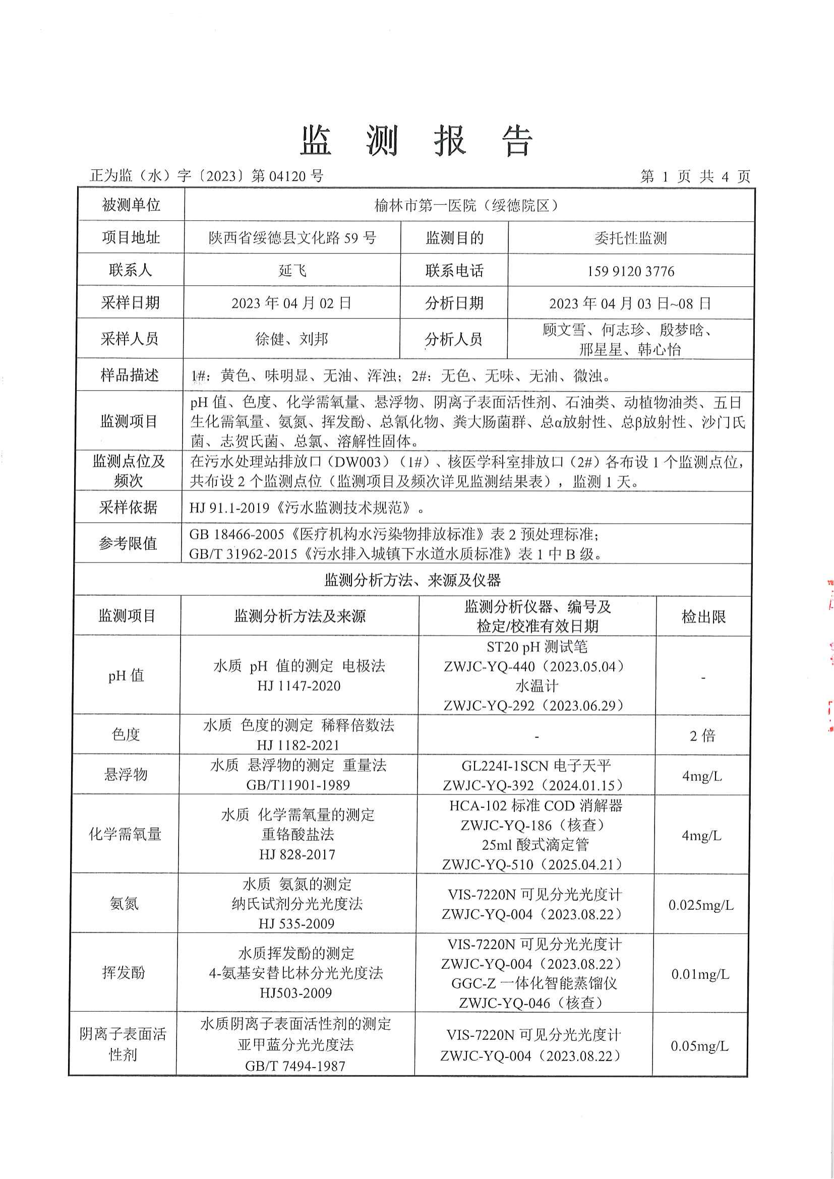 正为监(水)字 (2023)第04120号 榆林市第一医院(绥德院区)2023年4月份废水监测-2304043