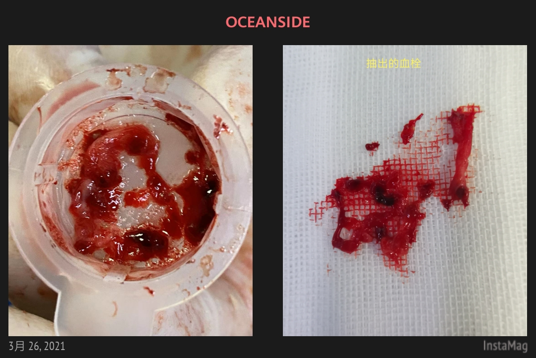 用尿激酶原溶栓,多次血管内抽吸血栓后,股总动脉、股深动脉、股浅动脉再通,血流恢复。